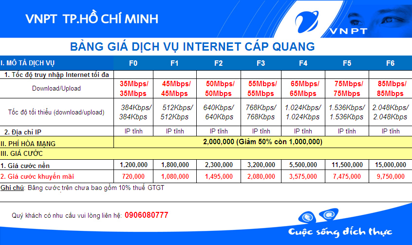 Gói cước intenret cáp quang của VNPT tại thành phố Hồ Chí Minh phù hợp từng đối tượng khách hàng khác nhau. Xem chi tiết bảng giá khuyến mãi: